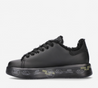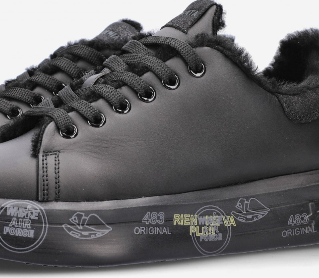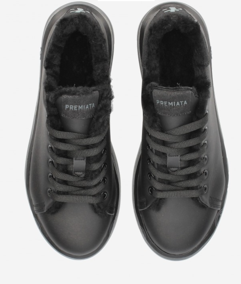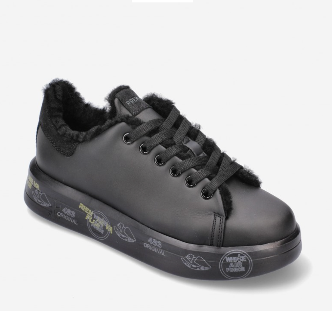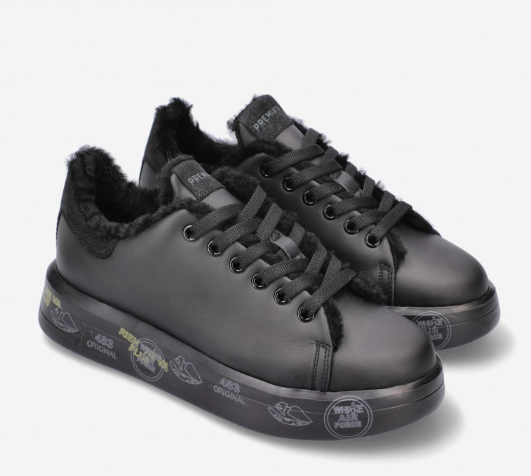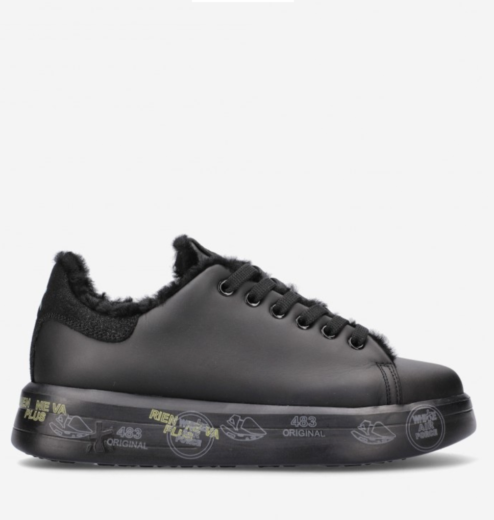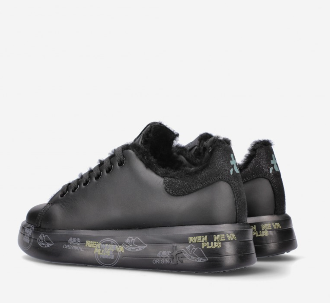 Premiata Belle 5074 sneaker made of soft black leather with faux fur lined interior. Glitter leather detail with logo on the heel, matching laces and black rubber sole with typical brand print. Height 3,5 cm.