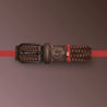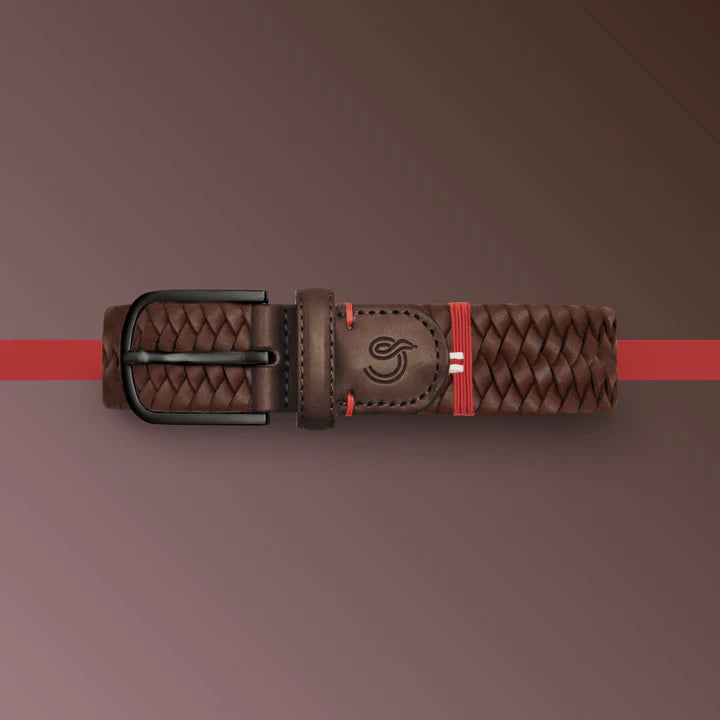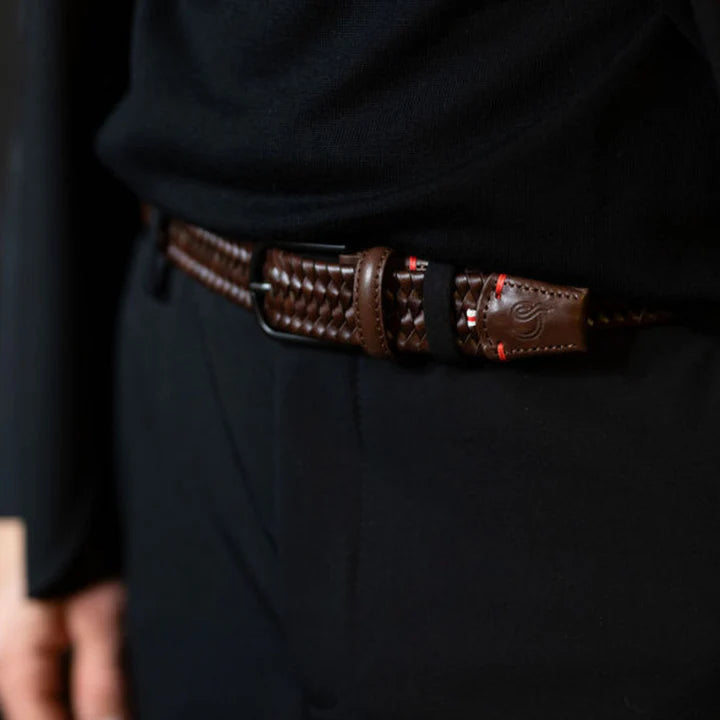 The Houston La Boucle belt, elastic braided in leather, brown colour. Finished with vegetable tanned Italian leather. Stainless steel buckle with black DLC Coating for optimal strength and durability, and minimal risk of skin allergic reactions.