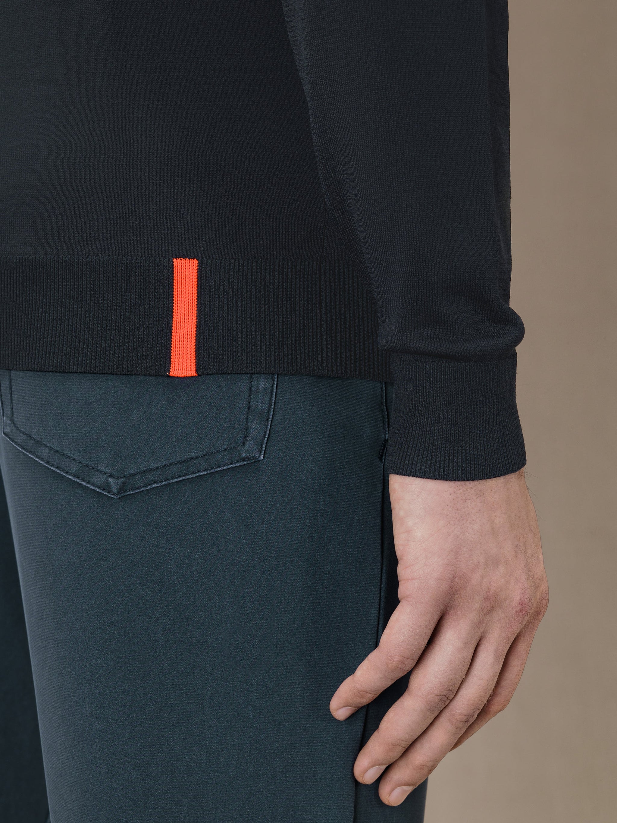 Protagonist of the milder days of mid-season. The softness and incredibly fine feel to the touch make the regular fit especially comfortable, naturally accommodating the body’s movements. The clean, essential design is completed with thin elastic ribbed detailing on the collar, cuffs, and hem, enhanced by the iconic orange trim. The excellent versatility of the Maxell Round Knit allows it to be worn under a blazer at the office or styled for various casual looks. Black micro-injected logo on the left sleeve.