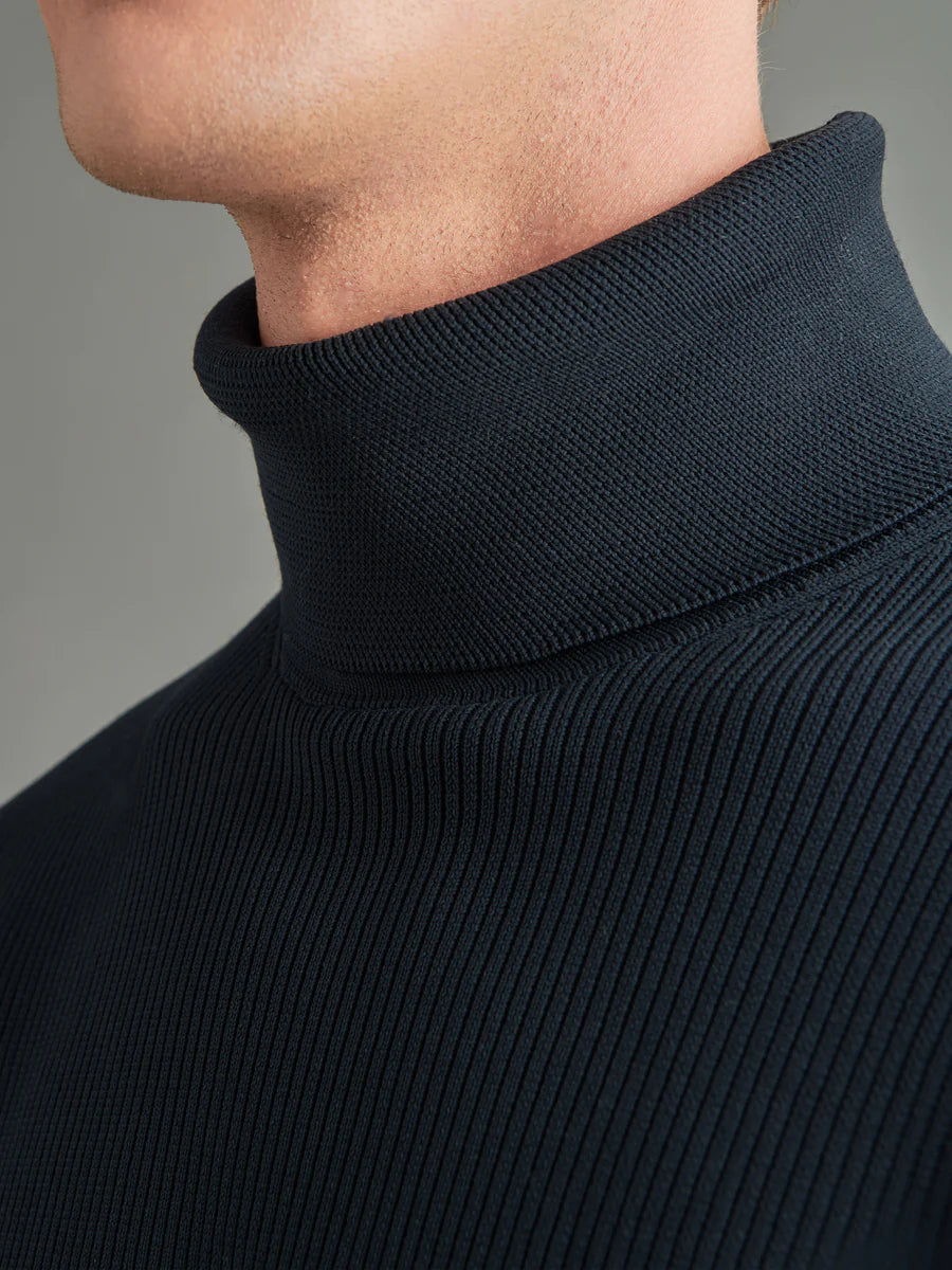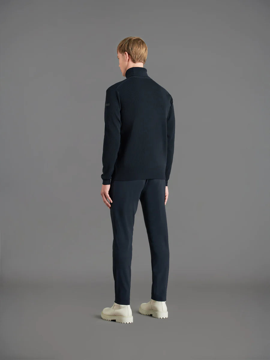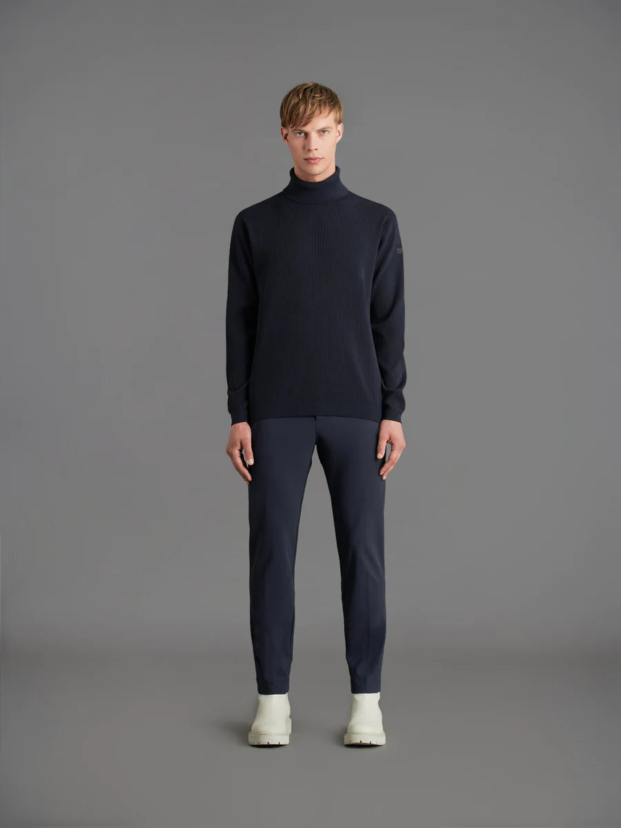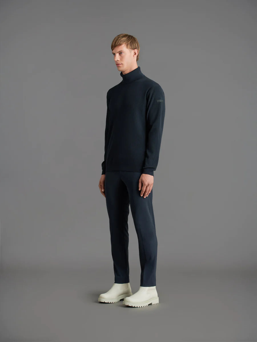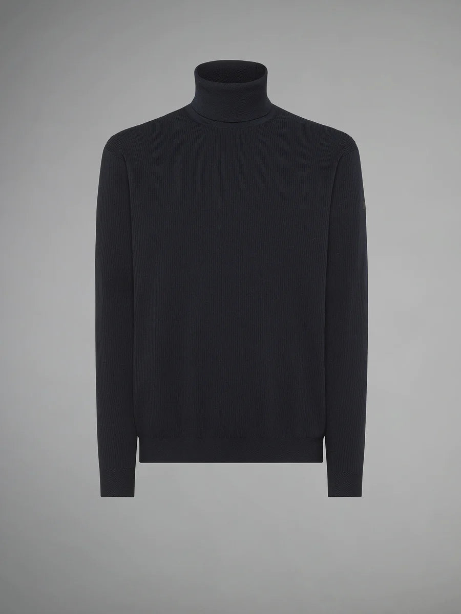 The dynamism and masculinity of the turtleneck sweater, an iconic men's wardrobe classic from the 60s and 70s, finds new inspiration in this plain-coloured model, which stands out for its straight, regular fit and the fine ribbing. The knit is so pleasant to wear, possibly under a textured jacket or accompanying a suit for a semi-formal office look. The high collar, sleeves and bottom featuring the iconic orange thread are knitted in stretch jersey for perfect wearability. The left sleeve is embellished with the signature black micro-injected logo.