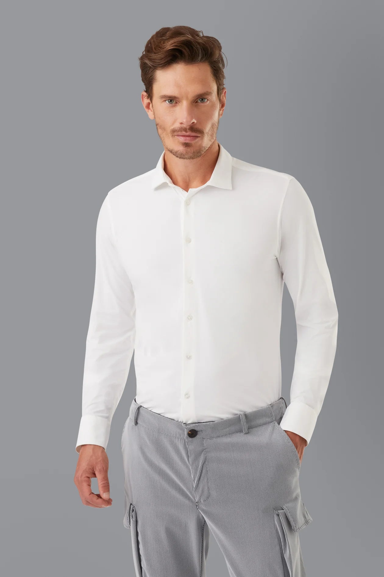 Classic flavour shirt with spread collar. Reinterpreted with the use of a fabric aesthetically similar to Oxford cotton, which is in fact an 86% polyamide and 14% elastane blend. The main characteristic of this garment is its extreme functionality thanks to the presence of a stretch fabric that facilitates elasticity, enabling freedom of movement. It does not require ironing and it is breathable and quick-drying.
