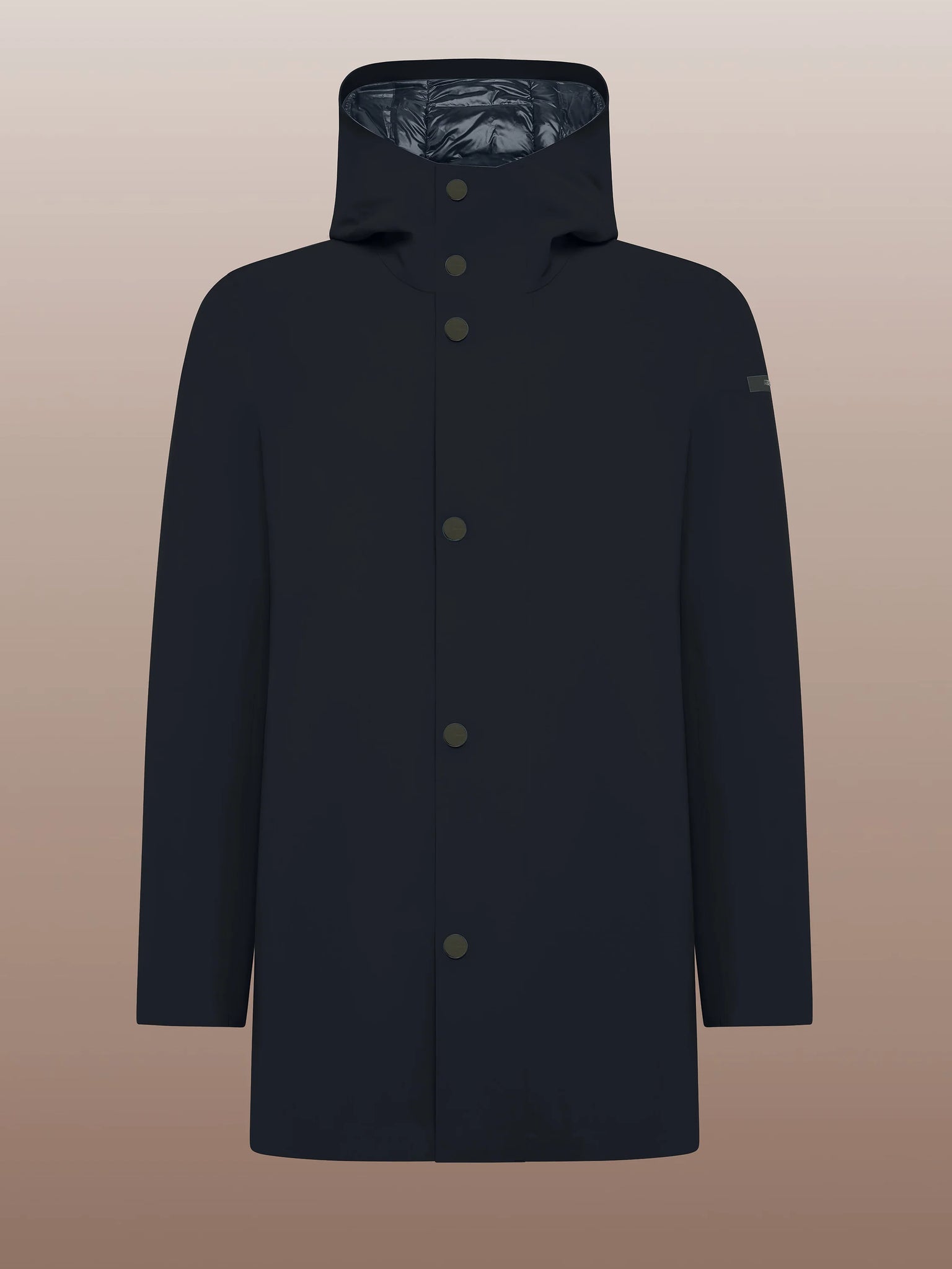 The modern, crystal-clear design stands out in this parka's totally seamless construction, both on the outer in exclusive SURFLEX® with a super-matt look, and in the glossy inner tubular channels. The breathable membrane Stratofabric#3 makes the jacket resistant to rain and wind. The 90/10 duck down filling ensures warmth, lightness and an impeccable fit due to the Floating Shield system. The purity of the seamless construction is punctuated on the front by the metal buttons on the flap, which conceals the zipper up to the wraparound hood, protecting the neck. Large side jetted openings provide access to the roomy inner pockets. Two inside pockets, with fluo orange double welt on the left. The heart tag 'Made with love, designed in Tuscany', plus the black micro-injected logo on the left sleeve sign a unique garment that slips confidently through the cold season.