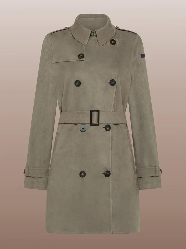 The timeless elegance of the over-the-knee trench coat is revisited in the attractive, soft-touch finish of nubuck-effect eco-suede. Revisited in a contemporary key the overcoat is showcased in the iconic double-breasted and belted fastening, embellished with the fine horn buttoning and the collar hook closure. The cuffs' strap adjustment and the black micro-injected logo on the left sleeve add a distinctive note to this authentic mid-season must-have, which can lend a chic and timeless elegance to any upper casual look.. The Nabucco Shell Trench Wom Jkt is a great choice of pairing with vibrantly printed shirts and straight trousers for a lavishly pragmatic outfit.