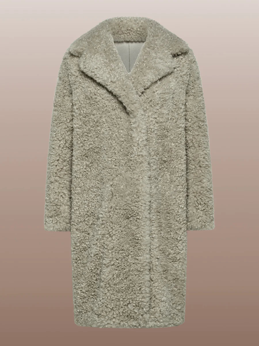An essential piece of outerwear in a woman's wardrobe to face the cold winter temperatures with style. Crafted from reversible premium faux fur that feels like the softness of lamb's fleece, the coat offers sophisticated and versatile comfort. The defined line and mid-length wraps the body with softness and warmth, providing a sensible protection during the coldest months of the year. The concealed front closure and contrasting teddy-effect trim are distinctive details that add a touch of modern elegance. Pair it with a cable-knit sweater and wrap skirt for a chic and timeless ensemble. Black micro-injected logo on left sleeve.