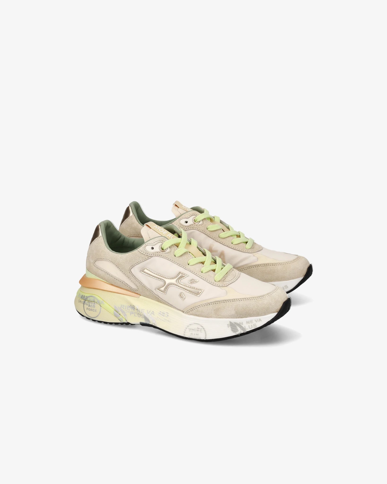 Designed to impress. The Moerun is based on the lightness of movement, stability and cushioning sensation given by the innovation of the bottom. The new silhouette is rich in details: logo on the outer side, PREMIATA writing on the inner side and name of the model on the label.