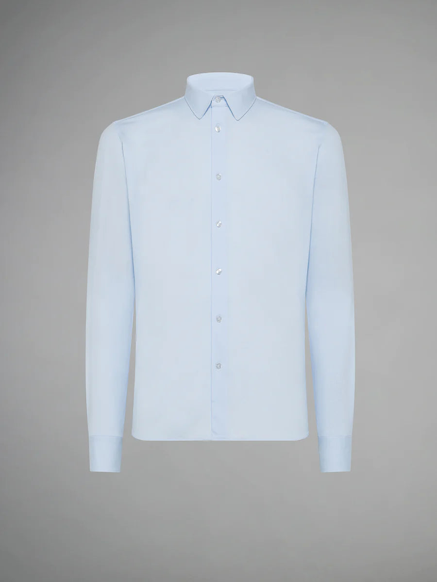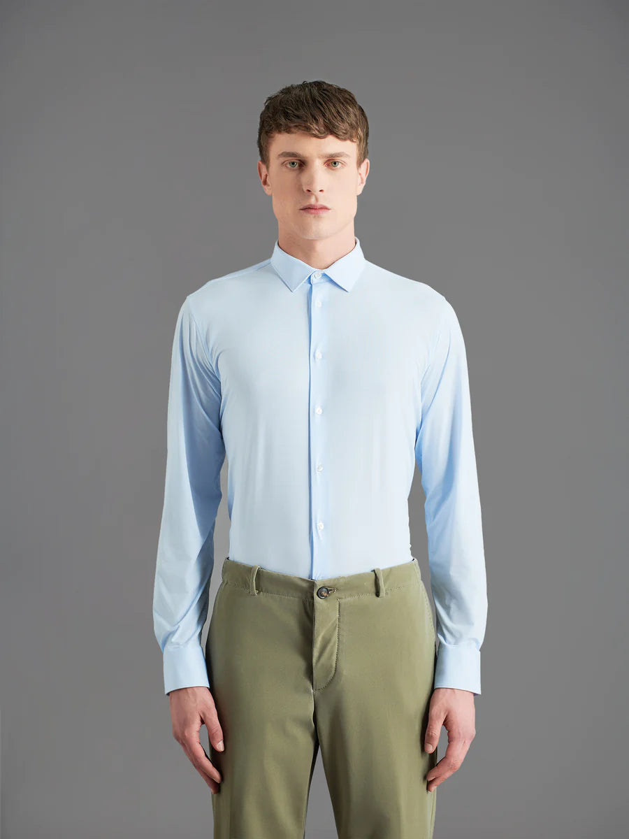The shirt made of fine jacquard e-quickdry Oxford fabric features long sleeves and an elegant slim fit. The unique model is available in a wide variety of geometric micro-patterns. Refined style details such as the open collar, the French mother-of-pearl buttoning and the regulation of the double mother-of-pearl button cuffs make it ideal for completing a formal outfit for the day's meetings, or for the following evening. Its lightness and breathability, its quick drying, anti-crease and easy care qualities also make it a fresh and tireless traveller.
