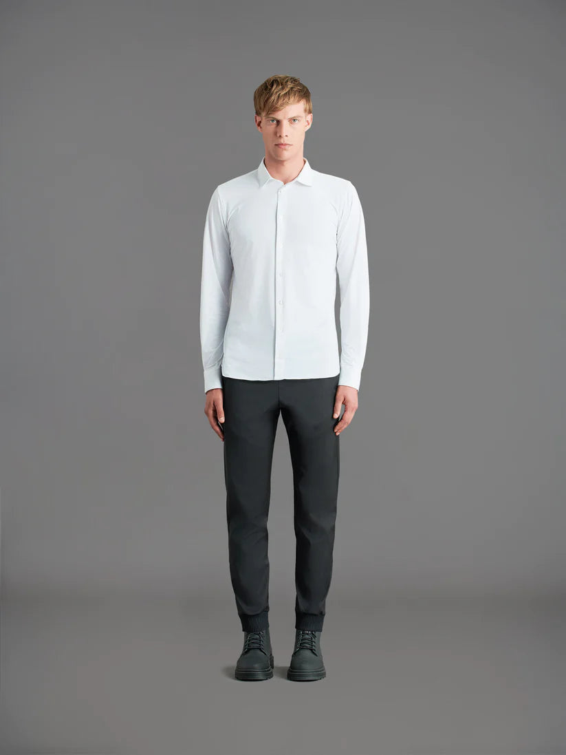 The creation is completed by the open collar and the mother-of-pearl French placket on the front, and on the cuffs. A men's wardrobe staple that can be combined with the other tailored garments from the collection.