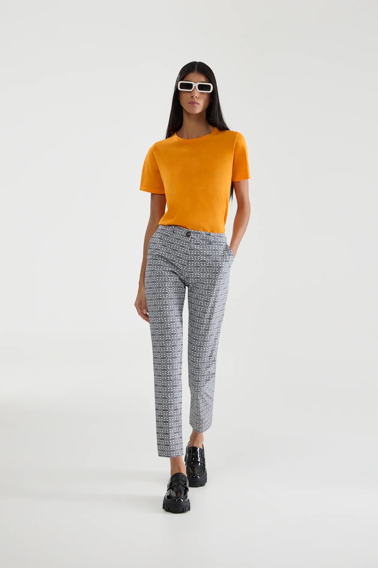 Elegant and practical, chinos are the iconic trousers of the season, and a perfect passepartout for the daytime. The refined jacquard geometric print of the Pant Bic Chino Wom is embellished with a silver thread that gently illuminates the pants, creating discreet and unexpected play of light. The cropped cut and the thin invisible pockets add a detail of refined contemporary energy to this garment.