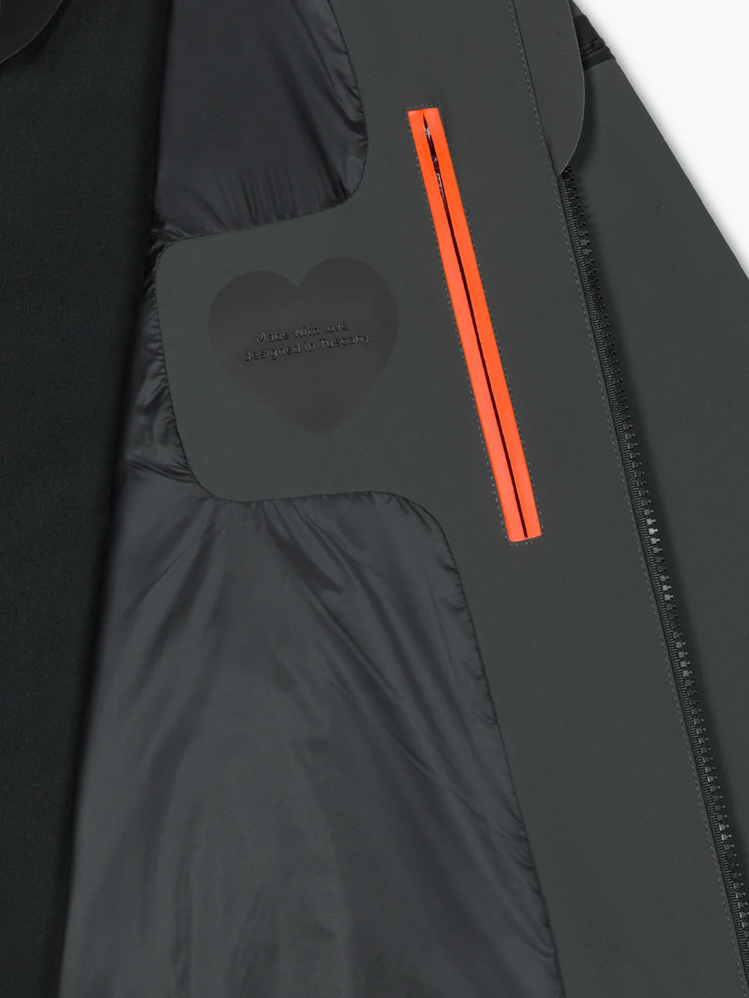 The refined construction, clean design, and super-matte look of our exclusive stretch fabric make the Surflex Benzina Jkt an instant classic for mid-season outdoor wear. Strong design accent is found in the thermo-taping featured on the vertical collar, in addition to the utility hood, full front zipper with a magnetic closure, and side pockets with invisible zippers. The regular fit is complemented by stretch ribbing at the cuffs and hem, while the contrasting interior is enlivened by the vertical breast pocket, whose zipper is concealed by the neon orange double welt, along with the iconic "Made with love, designed in Tuscany" heart tag. The black micro-injected logo on the left sleeve completes an absolutely contemporary outerwear.