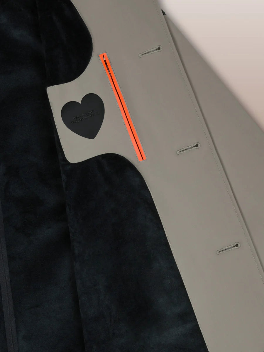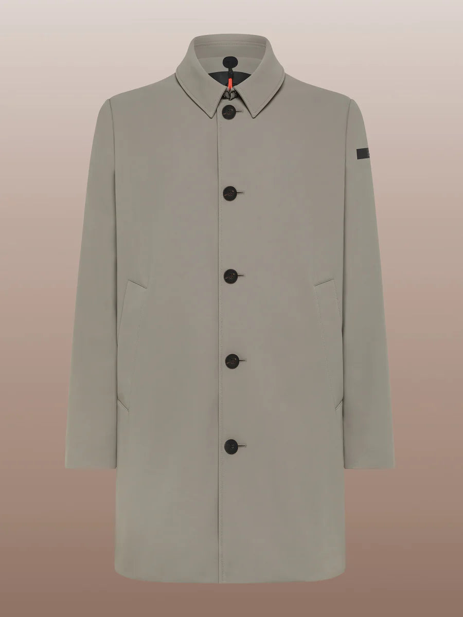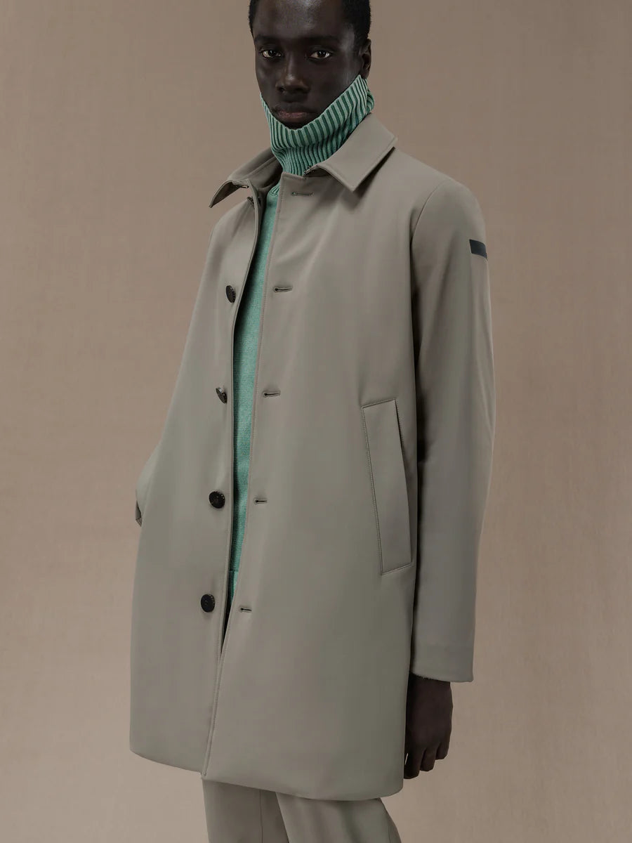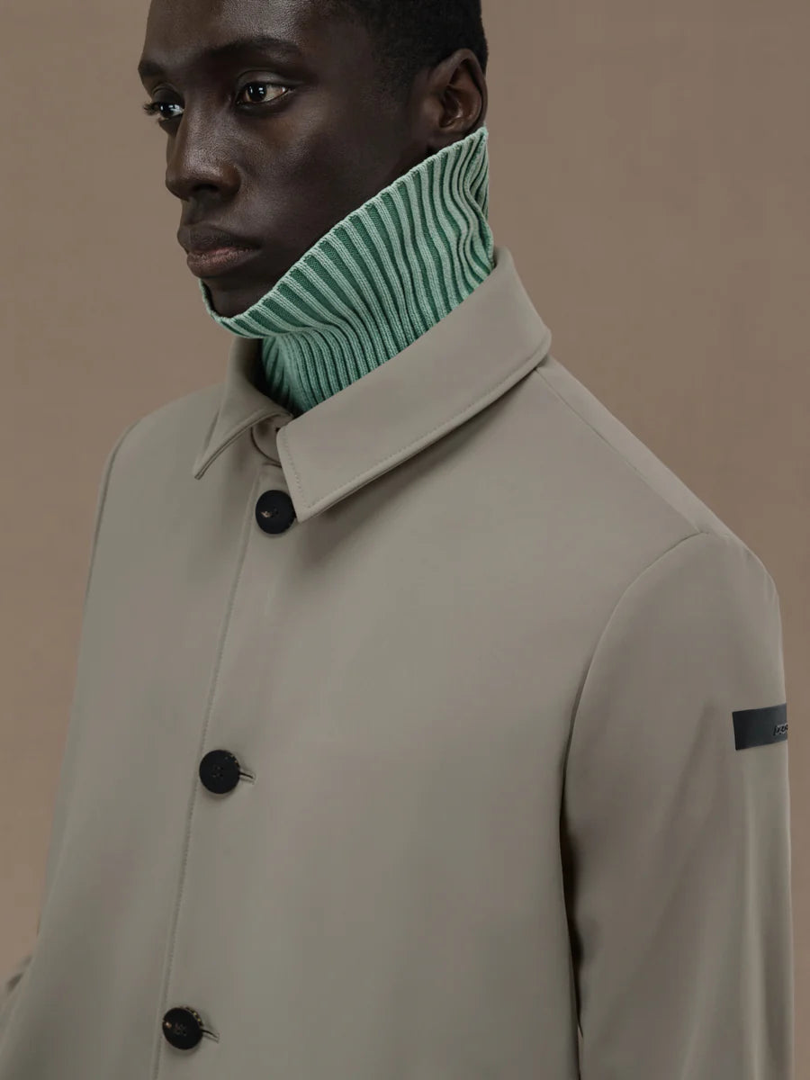 The car coat is still an undisputed favorite in the men's autumn wardrobe. This timeless classic is warm and comfy, featuring the membrane Stratofabric #3 construction with a super matt look SURFLEX® outer. Lightness, breathability and stretch combine with wind and rain resistance. The timeless design is enhanced by the fine horn placket and large side slash pockets, with the sartorial detail of four horn buttons on both cuffs. The central slit at the back allows freedom of movement. The elegant velvet lining features a breast pocket closed by an invisible zip, embellished with the fluo orange double welt and the heart tag "Made with love, designed in Tuscany". Signature black micro-injected logo on the left sleeve.
