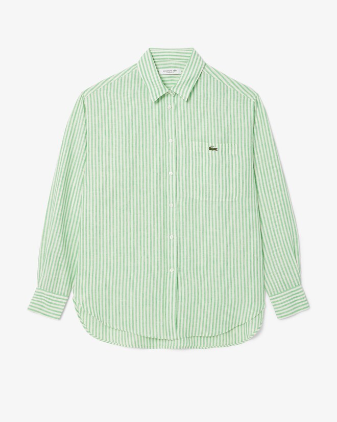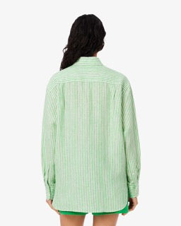Symbole de l’élégance à la française depuis 1933, Lacoste revisite la chemise à manches longues dans une version estivale. Confectionnée en lin léger et respirant, elle présente une coupe ample confortable et un imprimé reprenant les rayures emblématiques de la maison. Pour un style chic et intemporel.